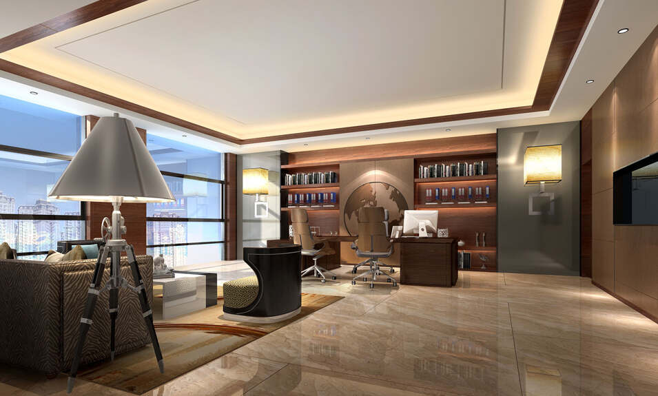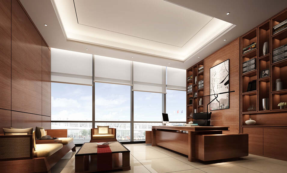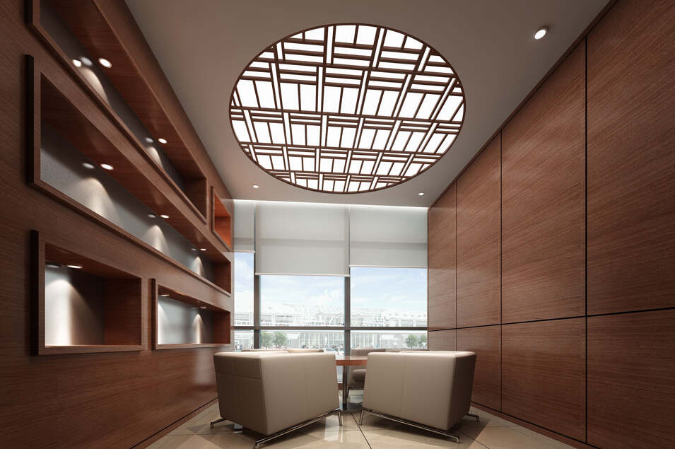 設計介紹:現代簡約凝重風如何展現?設計師們運用棕色的色調表現出凝重感,頂部圓形中國風網狀帶有悠久的中國藝術,天圓地方設計,使人一進入到這個辦公室給人與專業、理性的感覺,這點特別符合公司的企業文化。