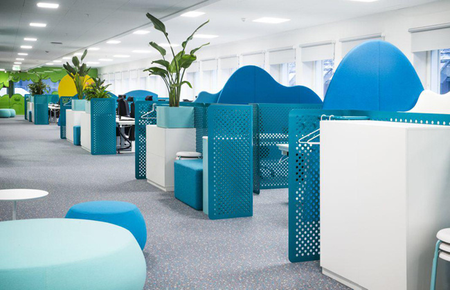 4、動(dòng)漫公司辦公室裝修:以一個(gè)開(kāi)放式的辦公環(huán)境為宗旨,旨在培養(yǎng)員工的團(tuán)隊(duì)協(xié)作能力和溝通能力,而隨處可見(jiàn)的沙發(fā)座椅大大方便了員工之間的溝通交流。放松心情的辦公氛圍也使得靈感隨時(shí)都有可能迸發(fā),公司員工能夠享受到以任何自己喜歡的方式進(jìn)行靈感的創(chuàng)作。除了主要的工作區(qū)域,辦公室的其他功能區(qū)也各具特色。以天然綠色為背景的圖書(shū)館能夠?yàn)閱T工提供寧?kù)o安逸的閱讀空間,另外還有包括蹦床、球類等讓員工可以盡情玩樂(lè)游戲室,閑暇之余聊天放松的咖啡廳。而餐廳的設(shè)計(jì)有吸引力,將餐廳設(shè)計(jì)成一個(gè)復(fù)古的美式游樂(lè)園,搖椅或旋轉(zhuǎn)木馬般的座位,極具童心童趣。