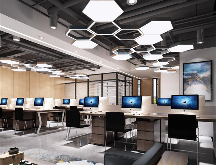 3、整體空間以現(xiàn)代科技感為主,運(yùn)用線條燈來營造空間的整體氛圍,提升科技感的體驗(yàn),在局部用活躍的顏色來跳動(dòng)整個(gè)空間的色彩,形成不一樣的風(fēng)格。會(huì)議室設(shè)計(jì)裝修使用簡(jiǎn)潔明了的軟膜天花,給予整個(gè)空間的光線之外,形成了自己獨(dú)特的裝飾作用。員工辦公室設(shè)計(jì)用六邊形的蜂巢燈具來打亂整個(gè)空間的死板性,讓整個(gè)空間更具有創(chuàng)新力。